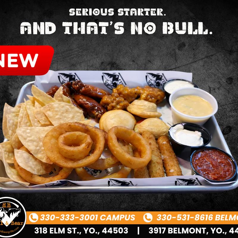 3 boneless wings, 3 traditional wings, 3 cheese sticks, 3 pierogi, onion rings, tortilla chips with 4 dipping sauces: queso dip, sour cream, ranch, marinara