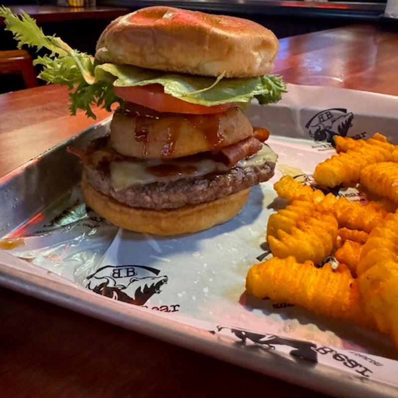 Angus burger topped off with cheese curds, a slice of pepper jack, and Bear sauce.