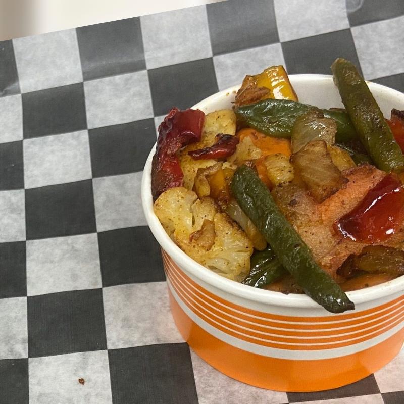 Two skewers served with seasonal grilled veggies with your choice of one side.